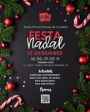 Volem convidar a tots els alumnes de l’EOI Ciutadella a la festa de Nadal que durem a terme el pròxim dia 15 de desembre. Tenim preparades moltes activitats: