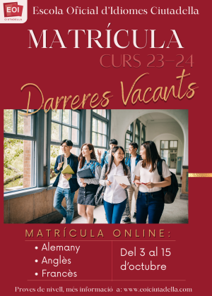 Per qualsevol dubte, contacta amb la secretaria del Centre (info@eoiciutadella.com / 971 38 17 42)