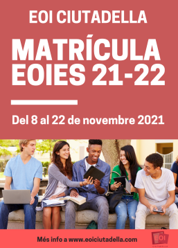 El període de matriculació és de dia 8 de novembre, a les 9:00 h, fins a dia 22 de novembre, a les 22:00 h. Quan t’hagis matriculat, has de trametre TOTA la documentació, en un únic correu, a info@eoiciutadella.com.