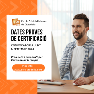3 maig, 2024 HORARIS EXÀMENS CERTIFICACIÓ MAIG/JUNY 2024 Aquí podràs consultar els horaris de les proves de certificació escrites i orals d’ALEMANY, ANGLÈS i FRANCÈS, per a la convocatòria ORDINÀRIA de 2024. També hi trobaràs les dates de publicació de notes i revisió d’exàmens. ATENCIÓ ALUMNAT EOIES: Els exàmens de certificació es duran a terme als VOSTRES CENTRES (IES / CC) En aquest enllaç podràs veure informació sobre les proves, incloent-hi mostres […]
