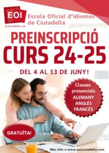 16 maig, 2024 PREINSCRIPCIÓ CURS 2024-2025- LLISTAT D’ADMESOS PREINSCRIPCIÓ GRATUÏTA del 4 al 13 de JUNY Vols aprendre ALEMANY, ANGLÈS OF FRANCÈS? Si és així, pots reservar plaça fent la preinscripció, però QUI ha de fer la preinscripció? LLISTAT DE PREINSCRIPCIONS ADMESES RESULTATS PROVES DE NIVELL PRESENCIALS Si no saps el teu nivell, podràs fer una prova d’anivellació: Anglès: telemàtica, durant tot el període […]