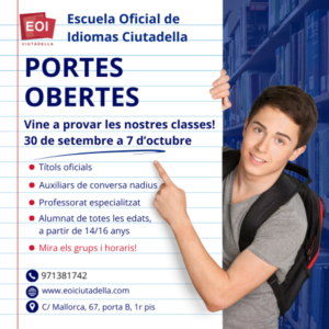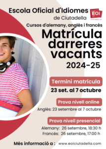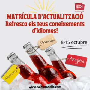 8 octubre, 2024 MATRÍCULA D’ACTUALITZACIÓ 2024-25 QUÈ ÉS LA MATRÍCULA D’ACTUALITZACIÓ? Matrícula per a persones que, havent superat amb anterioritat cursos de les Escoles Oficials d’Idiomes, volen actualitzar-ne els coneixements i es poden matricular en qualsevol dels cursos realitzats. Més info aquí. TERMINI DE MATRICULACIÓ: Del 8 al 15 d’octubre PROCEDIMENT DE MATRÍCULA: Fes la sol·licitud de la matrícula enviant un […]