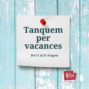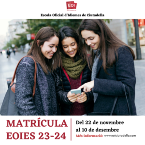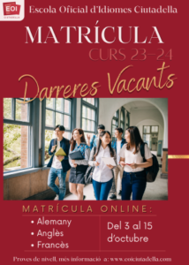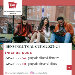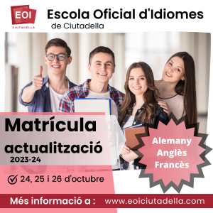 23 octubre, 2023 MATRÍCULA D’ACTUALITZACIÓ 24, 25 I 26 D’OCTUBRE Si has cursat i superat amb anterioritat cursos a una Escola Oficial d’Idiomes i voldries actualitzar els teus coneixements, encara pots matricular-te! HORARIS GRUPS I AULES 23-24 PROCEDIMENT DE MATRÍCULA: Fes la sol·licitud de la matrícula enviant un mail a info@eoiciutadella.com, amb l’assumpte “Matrícula d’actualització”, explicant l’idioma i el nivell al qual et vols matricular […]