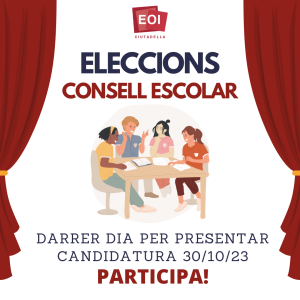 17 octubre, 2023 ELECCIONS AL CONSELL ESCOLAR 2023 Hem iniciat el procés de renovació del Consell escolar de l’EOI Ciutadella. Trobareu tota la informació relativa al procés publicada als suros de l’escola. Si vols participar per formar part del Consell escolar al sector de l’alumnat, comunica-ho al teu professor. Tens fins dia 30 d’octubre per presentar la teva candidatura. Anima’t a participar! […]
