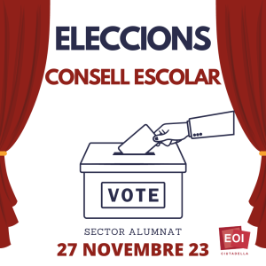 14 novembre, 2023 ELECCIONS AL CONSELL ESCOLAR- SECTOR ALUMNAT Dilluns, dia 27 de novembre, se celebren les eleccions dels representants de l’alumnat al Consell escolar, les quals tindran lloc al hall de l’escola, de 17:00 a 19:00 h. Els candidats a representants de l’alumnat són: GEMMA ARBÓS BABRA ( Francès Bàsic A2) MARIA PILAR DE OLIVAR VIVÓ ( Francès Bàsic A2) Aníma’t a participar! […]