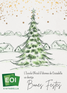 5 desembre, 2023 FESTA DE NADAL 2023 Volem convidar a tots els alumnes de l’EOI Ciutadella a la festa de Nadal que durem a terme el pròxim dia 15 de desembre. Tenim preparades moltes activitats: Concurs Gastronòmic –> consulta les bases aquí. Quiz Cultural Nadalenc Rifa Nadalenca Rifa Biblioteca Si participes, la diversió està garantida i hi ha bastants possibilitats […]
