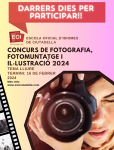 9 febrer, 2024 8È CONCURS DE FOTOGRAFIA/ FOTOMUNTATGE/ IL·LUSTRACIÓ T’agrada la fotografia o el fotomuntatge? Tens habilitat per a la il·lustració? Avui comença el termini per participar en el «Vuitè concurs de fotografia/ fotomuntatge / il·lustració» de l’EOI Ciutadella, que enguany és de TEMA LLIURE Tens fins a dia 16 de febrer de 2024 per enviar la teva creació a l’EOI Ciutadella. Hi ha PREMIS atractius esperant-te: […]