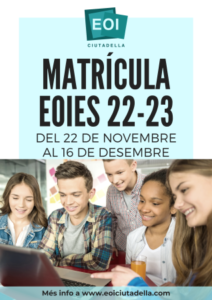 21 novembre, 2022 MATRÍCULA PROGRAMA EOIES (NOMÉS ALUMNAT D’ESO I BATX.) Matrícula EXCLUSIVA per a l’alumnat inscrit al Programa EOIES. Les persones que es matriculin i no estiguin inscrites dins el Programa EOIES no podran fer els exàmens. El període de matriculació és de dia 22 de novembre, a les 9:00 h, fins a dia 16 de desembre , a les 23:59 h. Quan t’hagis matriculat, has de trametre TOTA […]