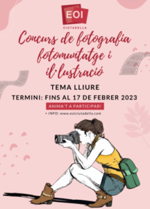 9 gener, 2023 7È CONCURS DE FOTOGRAFIA/ FOTOMUNTATGE/ IL·LUSTRACIÓ Ampliem el termini per enviar obres al concurs fins a dia 3 de març. T’agrada la fotografia o el fotomuntatge? Tens habilitat per a la il·lustració? Avui comença el termini per participar en el «Setè concurs de fotografia/ fotomuntatge / il·lustració» de l’EOI Ciutadella, que enguany és de TEMA LLIURE Tens fins a dia 17 de […]