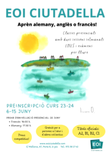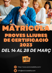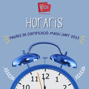 24 maig, 2023 HORARIS EXÀMENS CERTIFICACIÓ MAIG/JUNY 2023 Aquí podràs consultar els horaris de les proves de certificació escrites i orals d’ALEMANY, ANGLÈS i FRANCÈS, per a la convocatòria ORDINÀRIA de 2023. També hi trobaràs les dates de publicació de notes i revisió d’exàmens. En aquest enllaç podràs veure informació sobre les proves, incloent-hi mostres d’exàmens. Clica aquí per veure una explicació resumida de l’avaluació dels cursos de certificació i aquí per veure la Resolució. Els […]