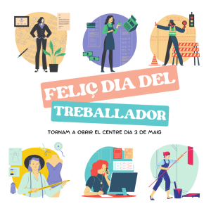 28 abril, 2023 DIA DEL TREBALLADOR El centre romandrà tancat els dies 1 i 2 de maig. Tornem a la feina dia 3 de maig. Bon pont a tots!