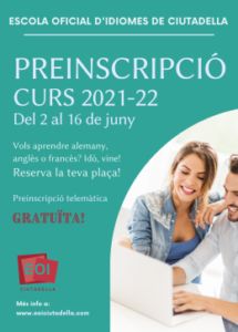 27 maig, 2021 PREINSCRIPCIÓ CURS 2021-2022 LLISTAT DEFINITIU D’ALUMNAT PREINSCRIT ADMÈS PREINSCRIPCIÓ GRATUÏTA del 2 al 16 de juny. INFORMACIÓ PREINSCRIPCIÓ JUNY CURS 2021-22 OFERTA D’DIOMES I NIVELLS CURS 2021-22 Si no saps el teu nivell, podràs fer una prova d’anivellació: -Anglès: telemàtica, durant tot el període de preinscripció -Alemany: presencial, dia 18 de juny, a les 17:30 h -Francès: presencial, […]