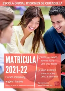 23 setembre, 2021 COMENÇAMENT DEL CURS 2021-22 Aquestes són les dates de l’inici del curs segons els diferents grups: 4 d’octubre: grups de dilluns i dimecres 5 d’octubre: grups de dimarts i dijous i grup semipresencial B2.2- A Anglès Si t’ha passat per alt la matrícula, encara tindràs una oportunitat d’inscriure’t entre l’11 i el 14 d’octubre (Matrícula darreres vacants).