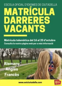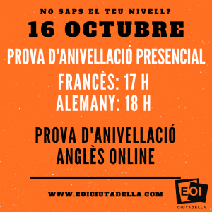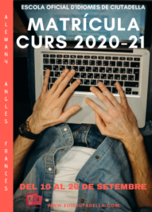13 octubre, 2020 PROVES D’ANIVELLACIÓ Prova d’anivellació per la matrícula de darreres vacants. -Francès (Presencial): 16 d’octubre a les 17 h. Aula 4 -Alemany (Presencial): 16 d’octubre a les 18 h. Aula 1 Cal contactar amb secretaria per correu electrònic o telèfon abans de fer la prova presencial. –Anglès (Online): 16 d’octubre, des de les 7 fins a les 23.59h. […]