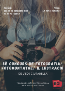 10 desembre, 2020 5è CONCURS DE FOTOGRAFIA/ FOTOMUNTATGE/ IL·LUSTRACIÓ AMPLIACIÓ TERMINI FINS AL 15 DE MARÇ! T’agrada la fotografia o el fotomuntatge? Tens habilitat per a la il·lustració? Avui comença el termini per participar en el “Cinquè concurs de fotografia/ fotomuntatge / il·lustració” de l’EOI Ciutadella. Tema: “La nova realitat“ Tens fins al dia 15 de març de 2021 per entregar la teva creació a […]