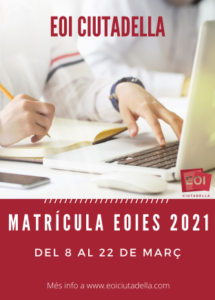 7 març, 2021 MATRÍCULA EOIES 2021 (ALUMNAT ESO I BATX.) Matrícula EXCLUSIVA per a l’alumnat inscrit al Programa EOIES. Les persones que es matriculin i no estiguin inscrites dins el Programa EOIES no podran fer els exàmens ni tindran dret a devolució de taxes. El període de matriculació és de dia 8 de març, a les 9:00 h, fins a dia 22 de març, a […]